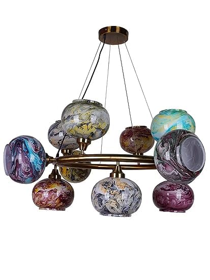 This modern glass candelabra is well liked, modish & durable. It features a cluster of assorted multi colored glass marbles globes attached to a circular steel frame in antique gold finish. The multicolor globe lights generate a sense of contemporary & modern design. The chandelier is eye-catching and a great focal point in any place like the lobby, living or dining room.